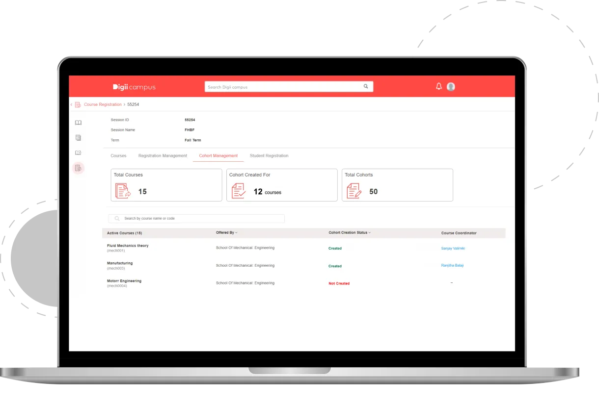 With our smart course registration system administrators can create a new session for an active term to manage courses, create cohorts, student registration, and much more