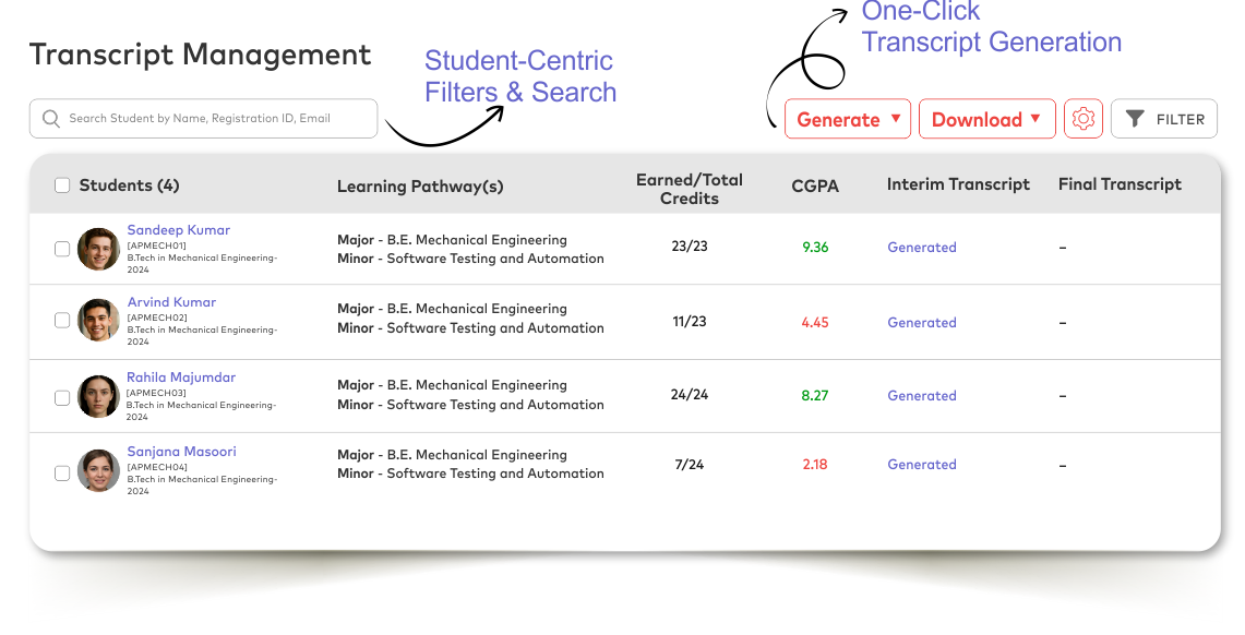 Automate transcript and certificate generation with smart templates, bulk actions, and intelligent filters.