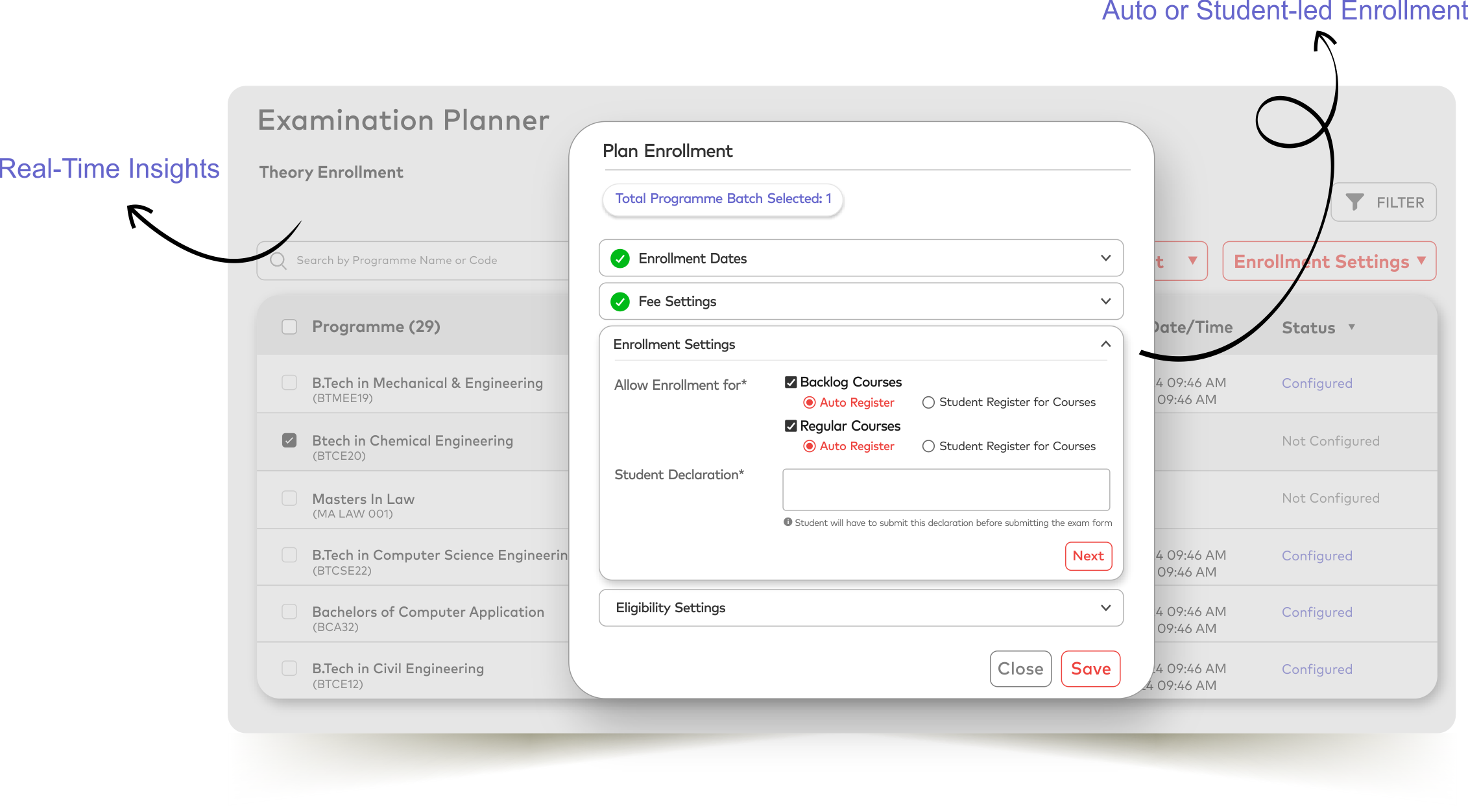 Get a head start on smooth exam operations with mapped students, real-time infra data, and automated eligibility checks.