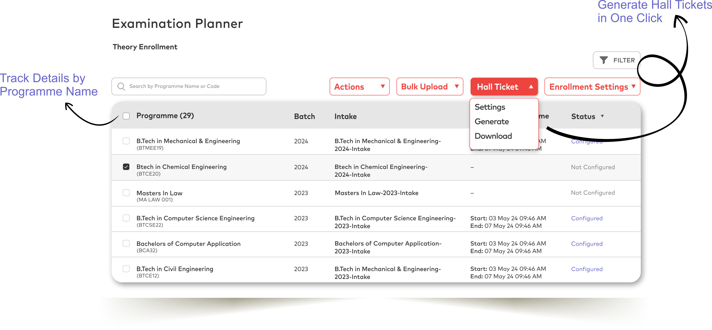 - Hall ticket generation & automated alerts