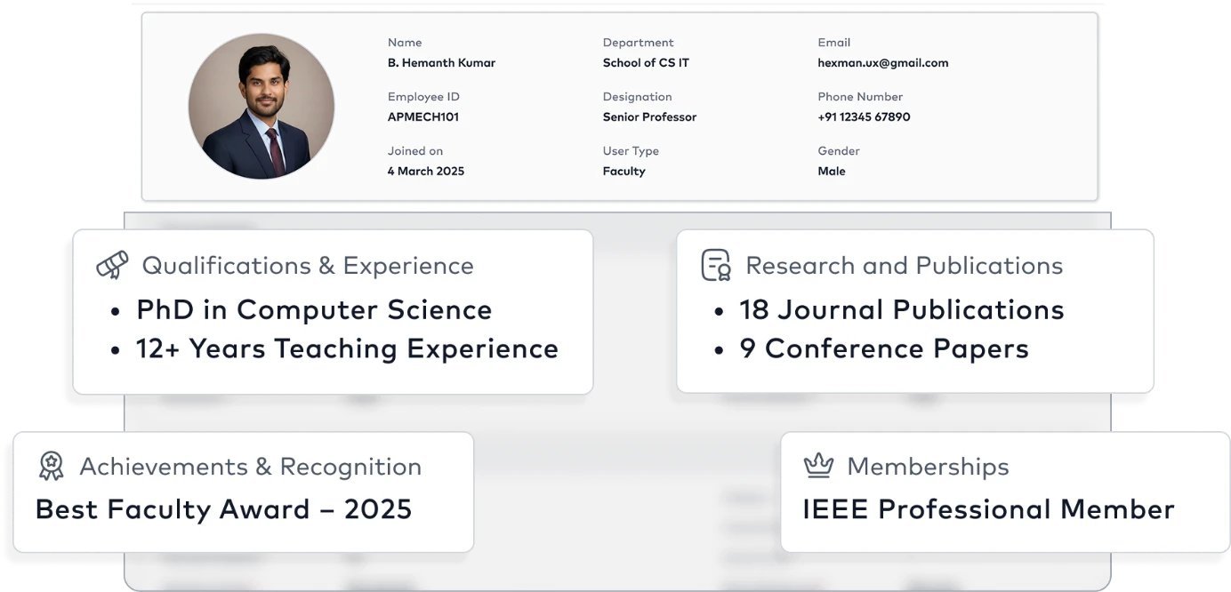 - Store complete personal, qualification, experience, and document details
