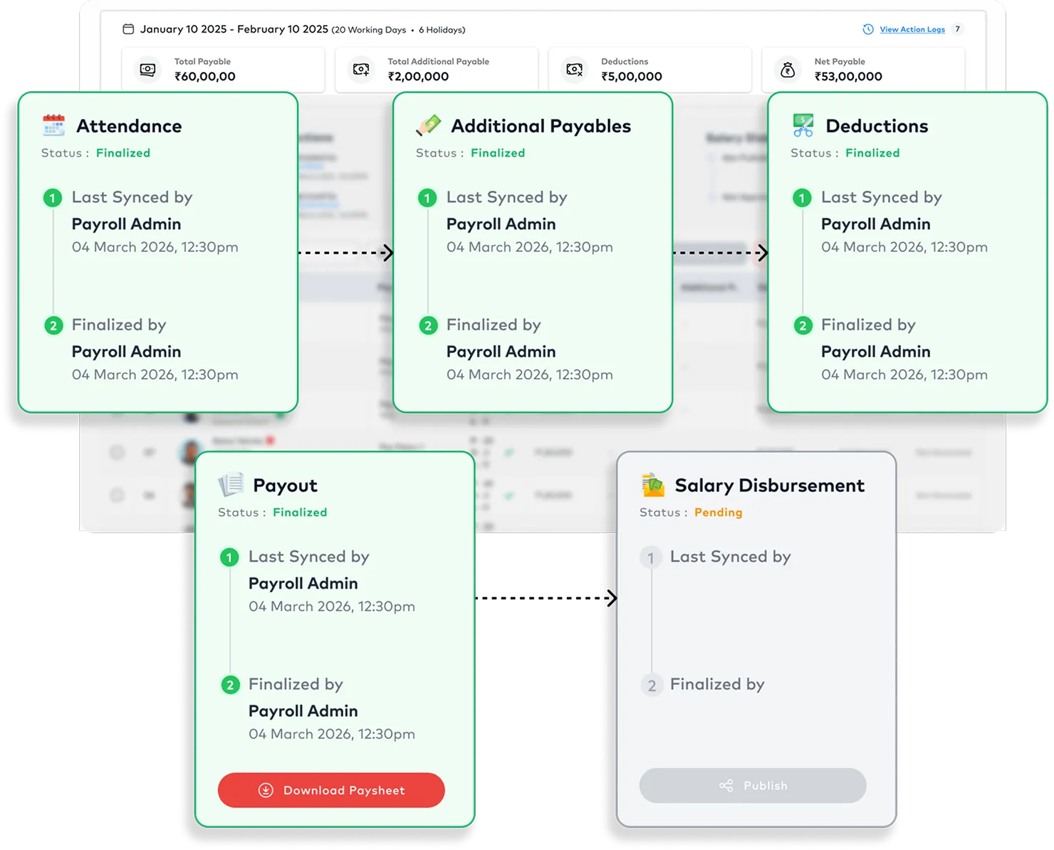 - Sync attendance, leave, and pay components automatically
