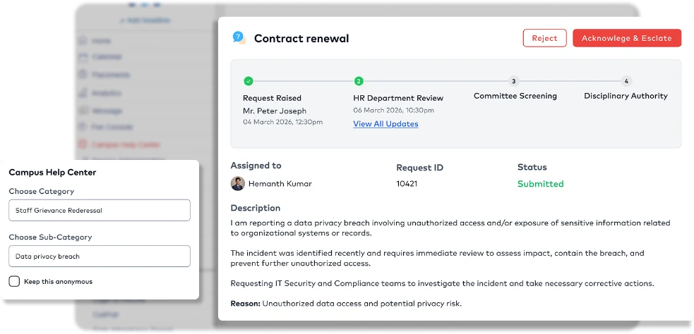- Raise grievances or wellness requests securely through a centralised platform