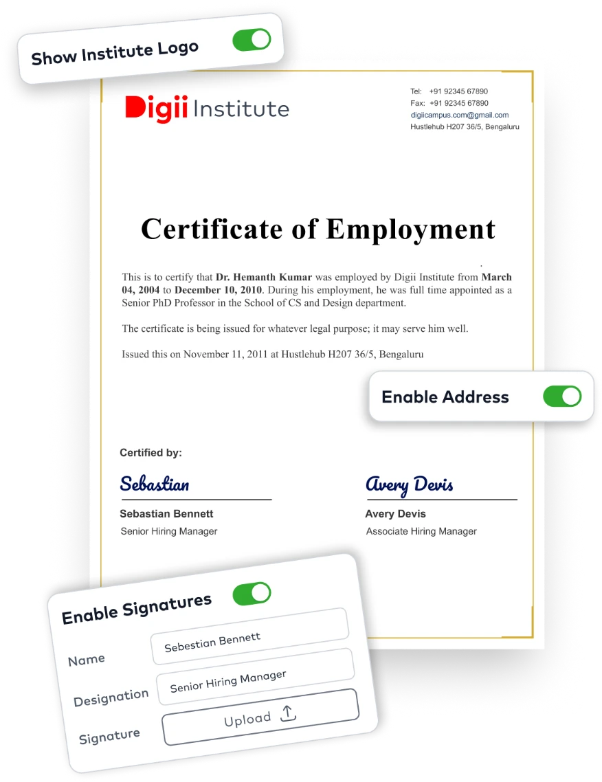 - Generate certificates such as NOC, proof of employment, and proof of address