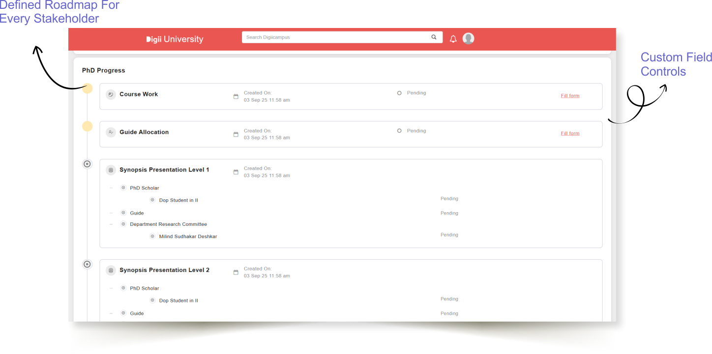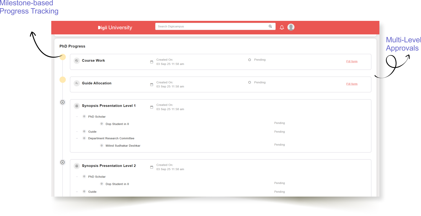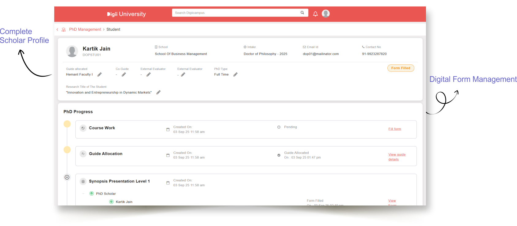 The Digiicampus PhD Management System streamlines doctoral research administration — from coursework to completion of PhD degree — with transparency, compliance, and efficiency.