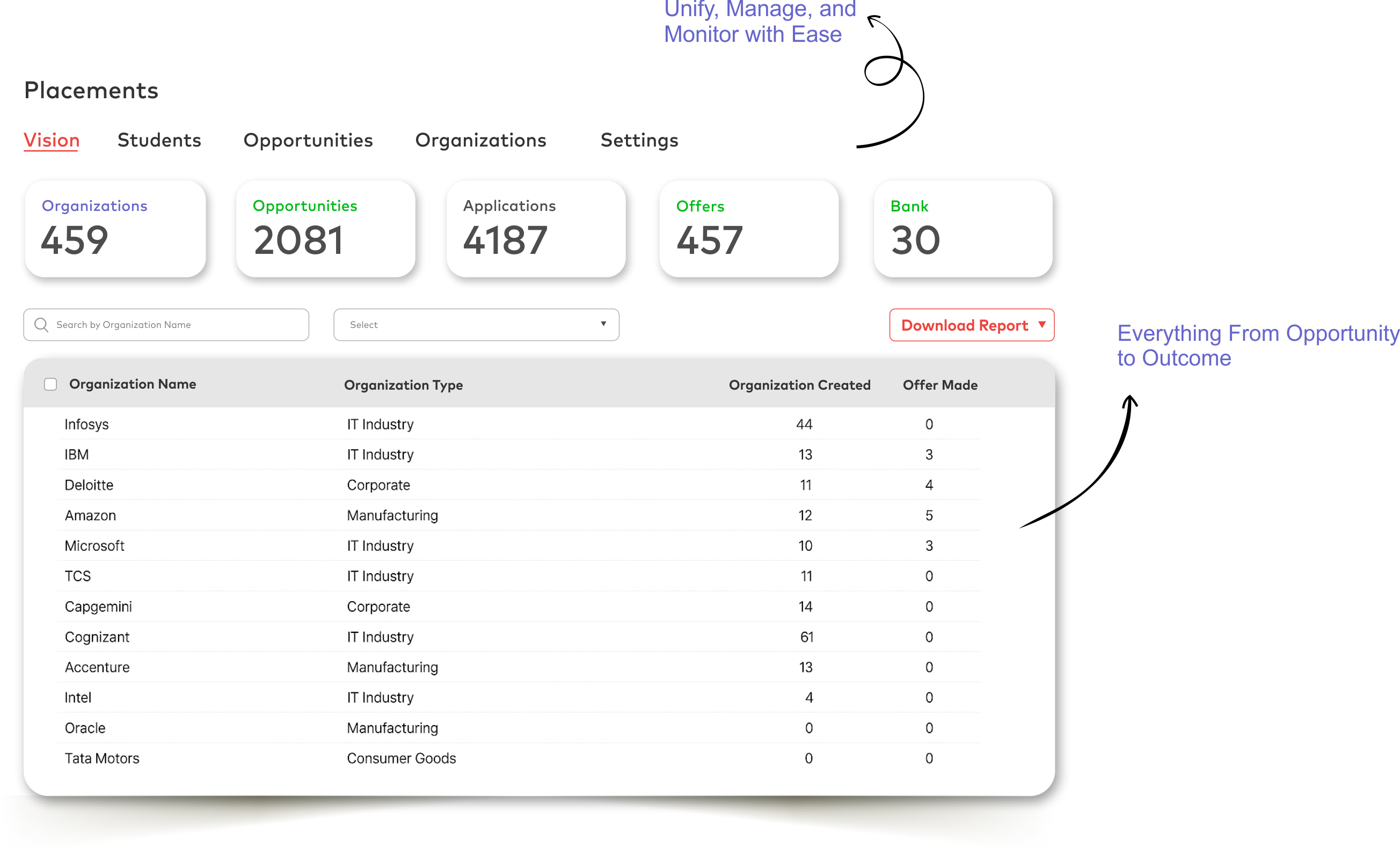 Reimagine campus placements with a tech-first platform that unites placement officers, recruiters, and students—built specifically for Higher Ed institutions.