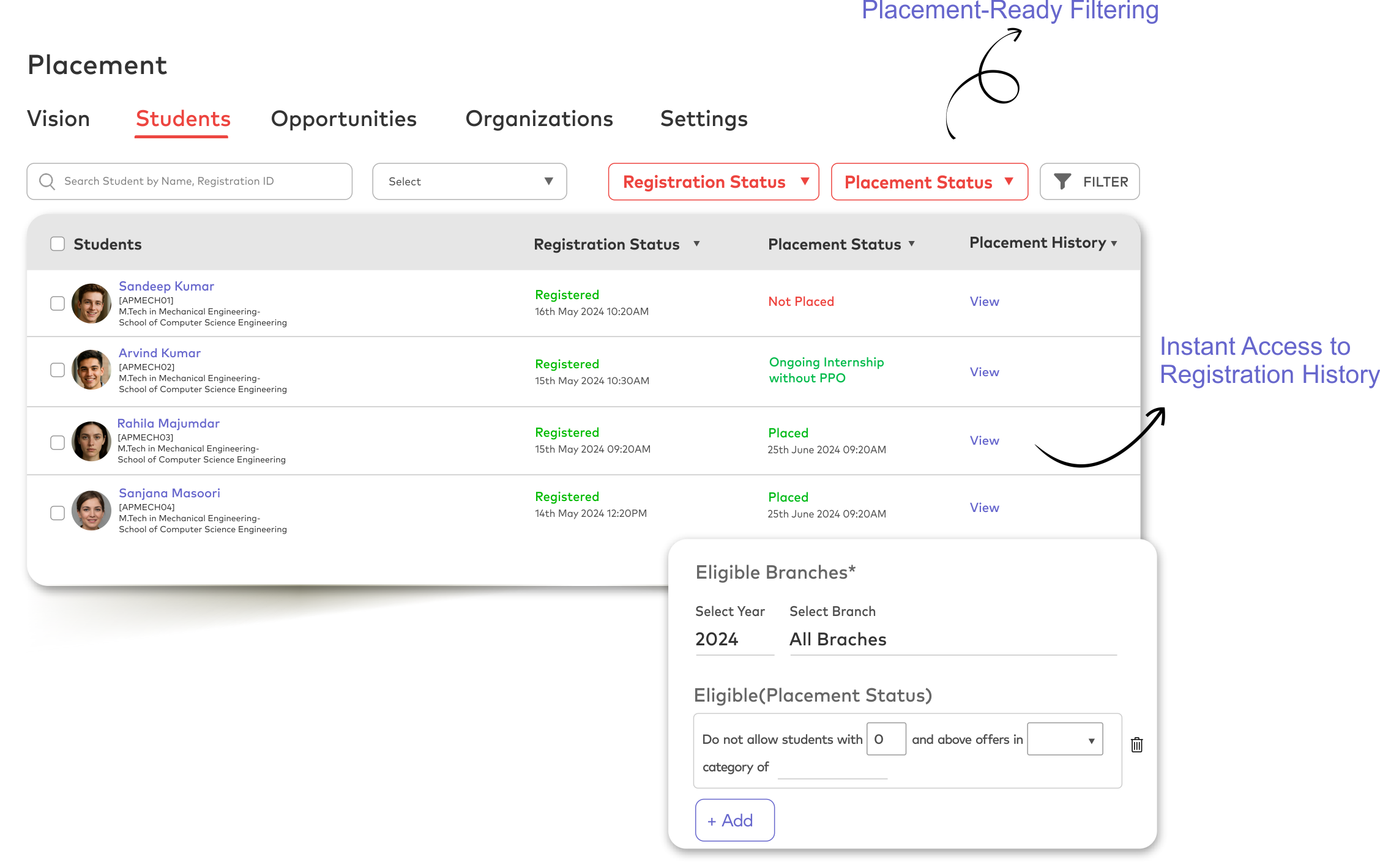 - Auto-filter by criteria like program, CGPA, and skills