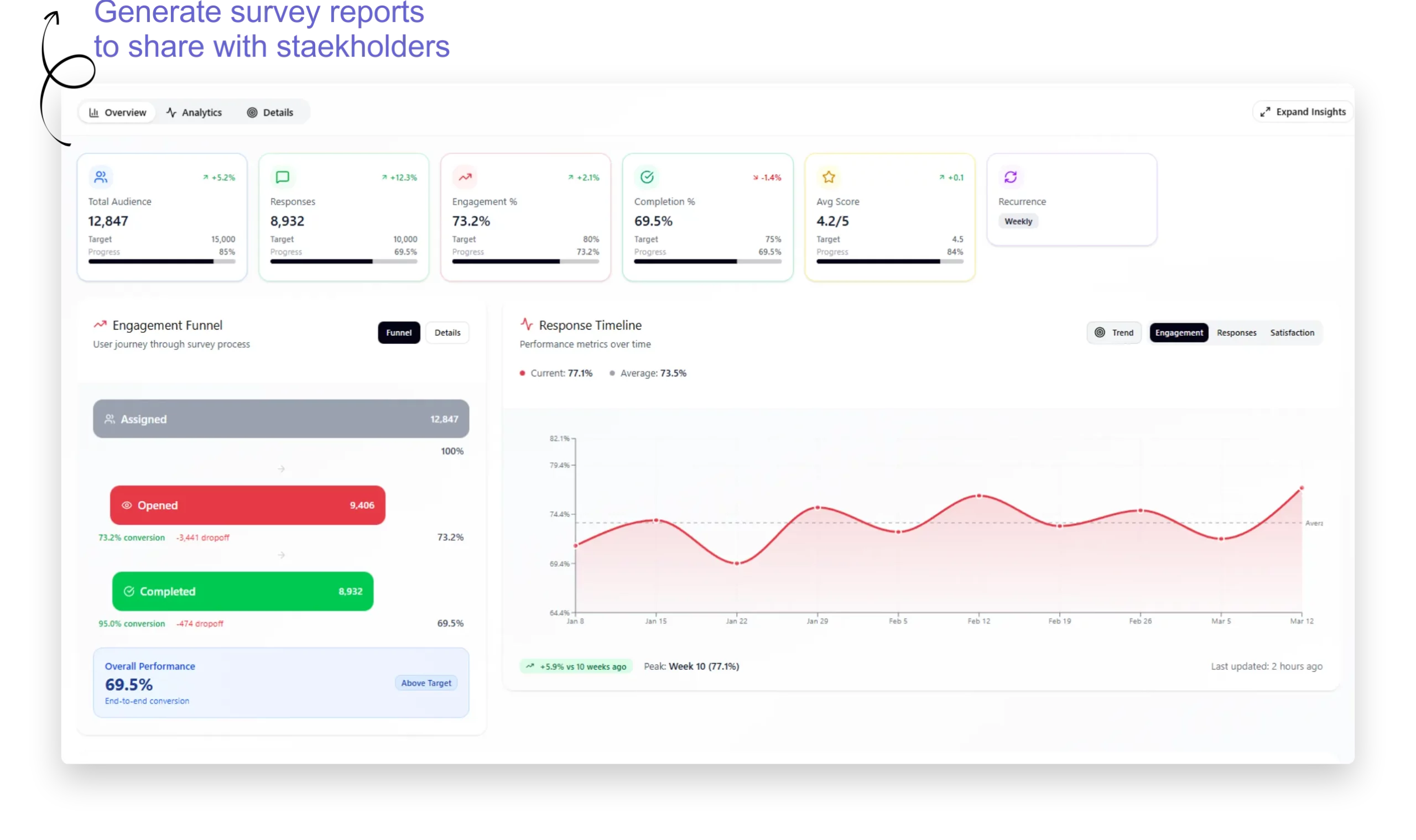 Launch surveys with precision—pick your audience, set schedules, enable anonymity, and automate recurring campaigns without manual effort.