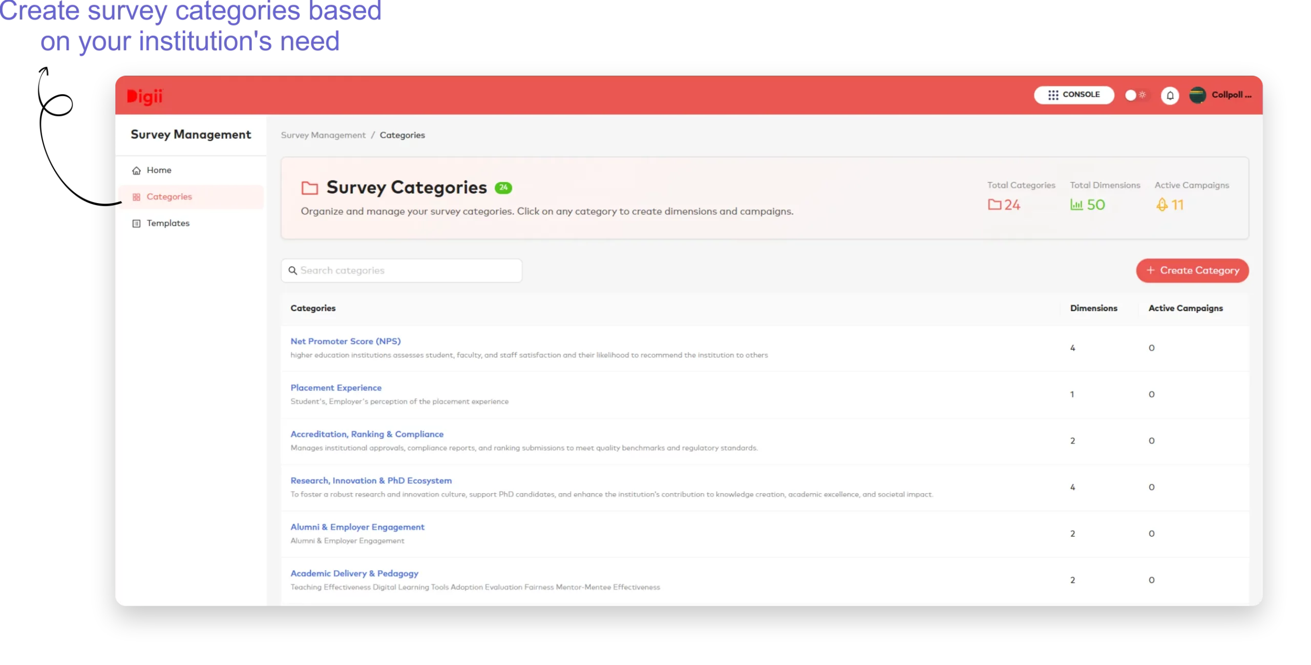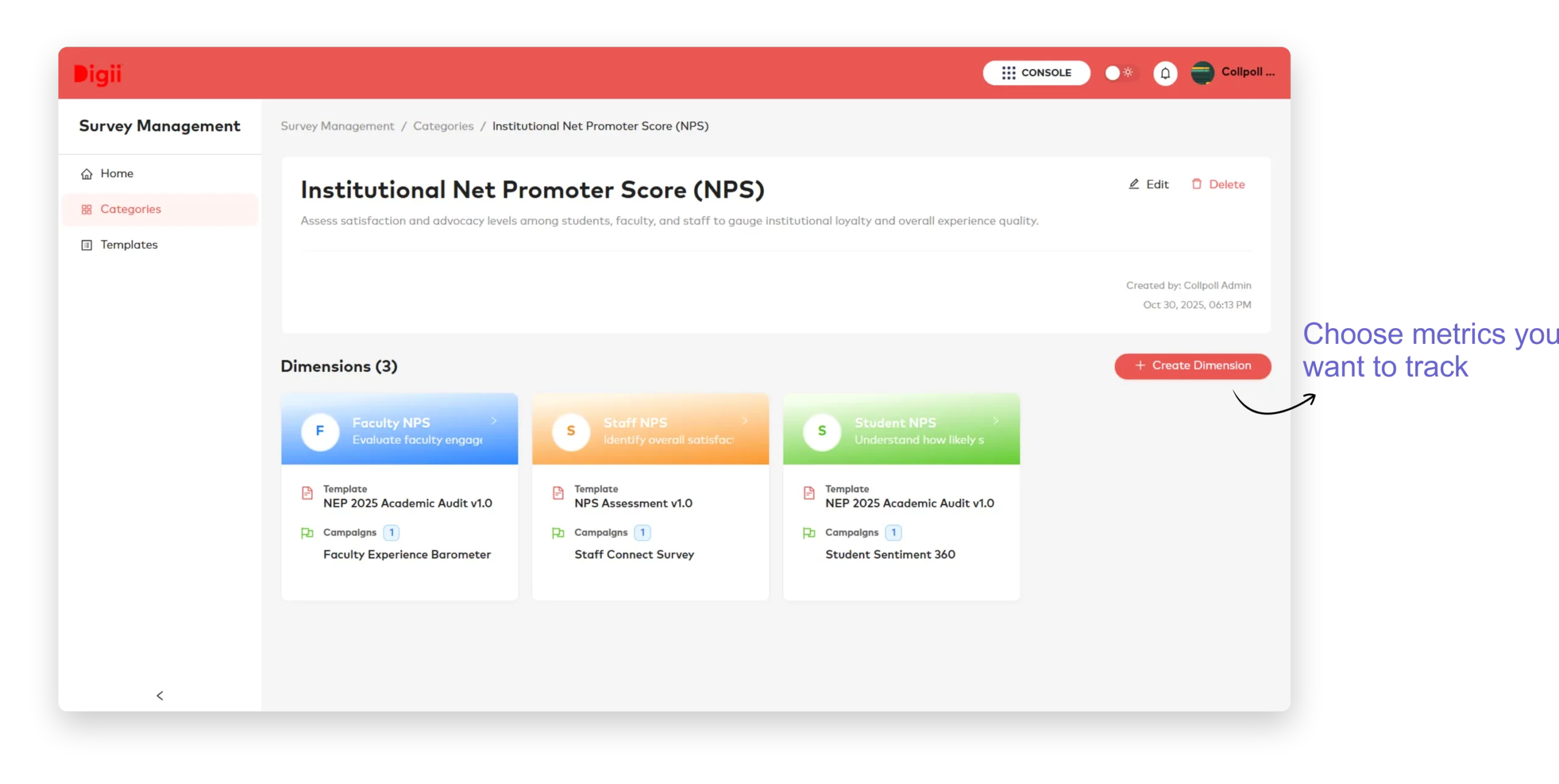 Use categories (e.g., Student Experience, Infrastructure, Course Delivery) to organise your entire survey ecosystem. Add dimensions under each category and set the baseline logic for how questions behave.